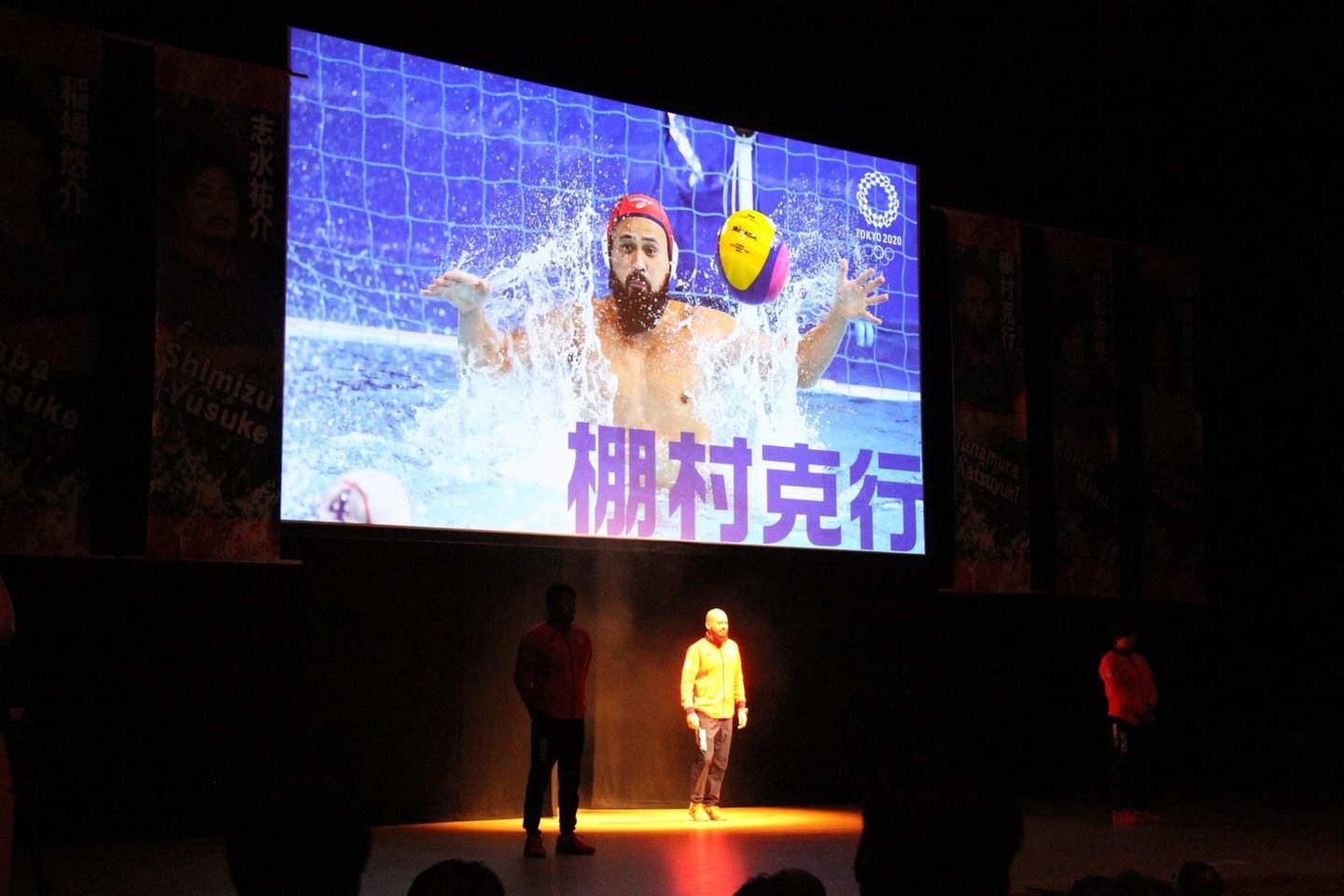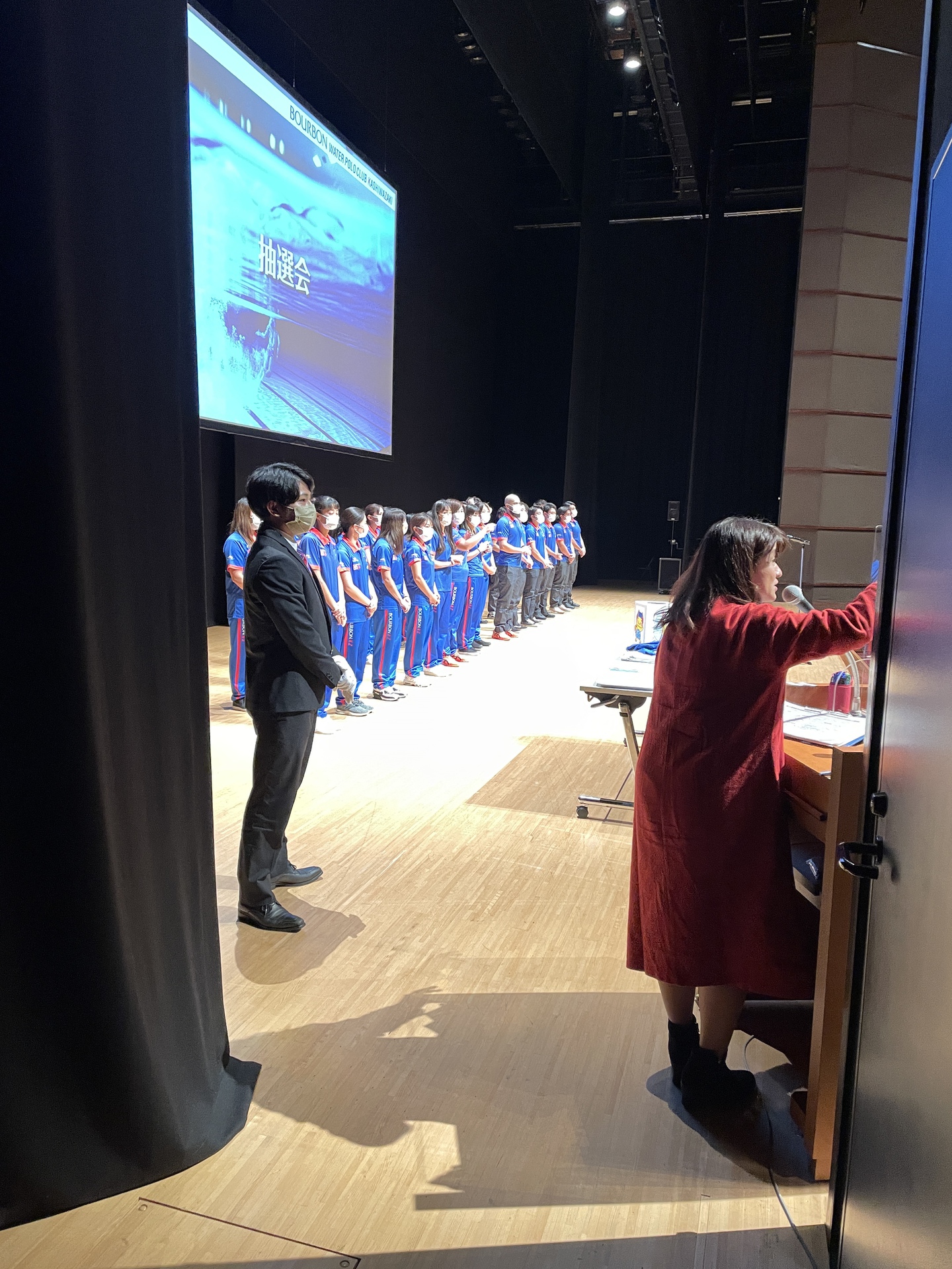 その後開催された、ブルボンウォーターポロクラブ柏崎 日本選手権壮行会。選手登場シーンなど工夫を凝らしました。