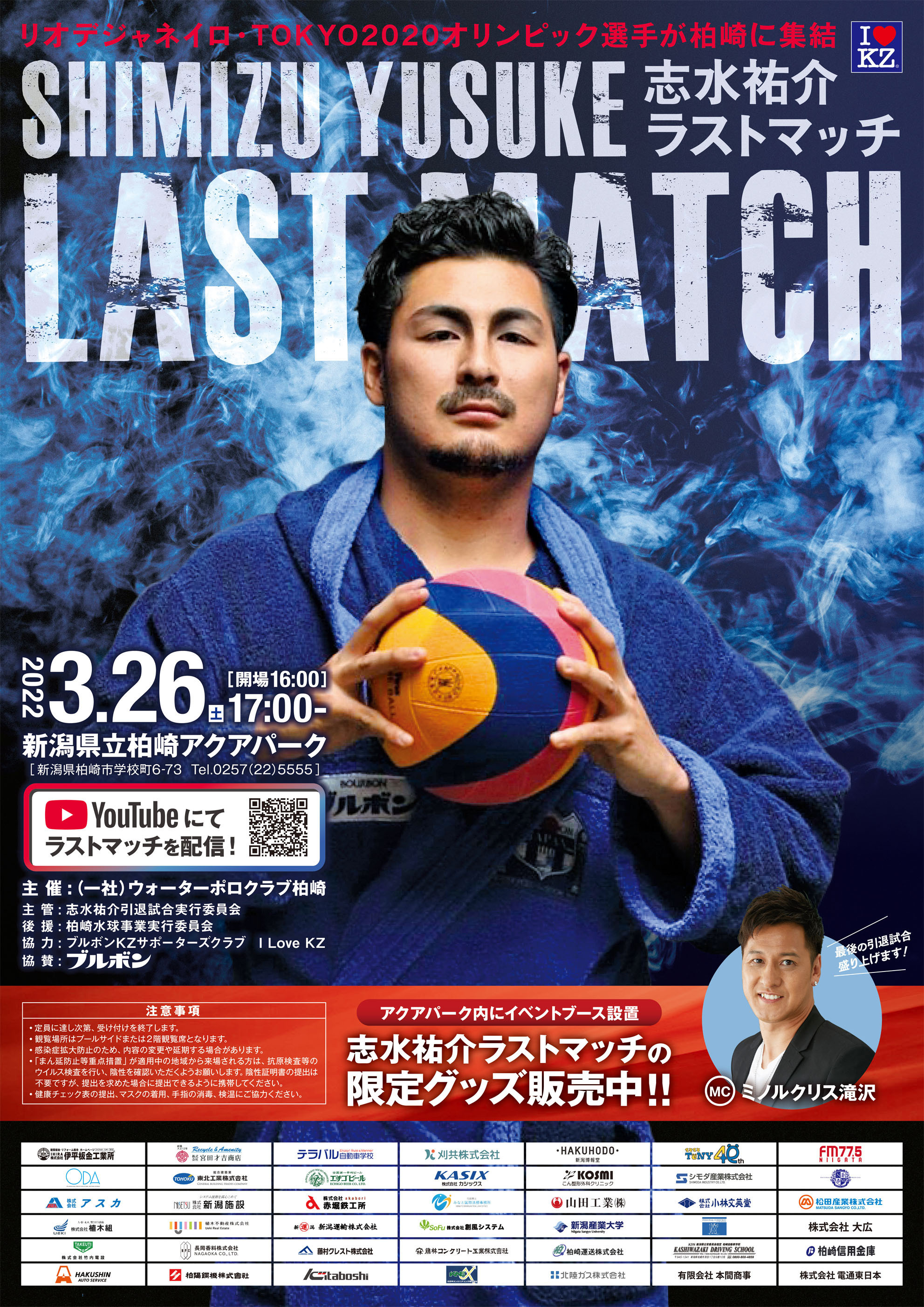 2022年3月26日(土)新潟県立アクアパークにて、「志水祐介ラストマッチ」を開催しました。水球の現役日本代表選手から、OB日本代表選手・ブルボンKZ現役選手・OBブルボンKZの豪華な顔ぶれで、志水選手の引退試合が盛り上がりました。今回のラストマッチも企画・運営いたしました。YouTubeにアーカイブが残っていますのでご覧ください。